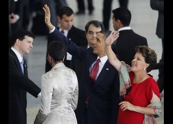 Brazilian President Dilma Rousseff (R) and U.S. President Barack Obama wave to primary school students in Planalto Palace in Brasilia, March 19, 2011. Obama is on the first leg of a three-country tour of Latin America. REUTERS/Ricardo Moraes (BRAZIL – Tags: POLITICS)