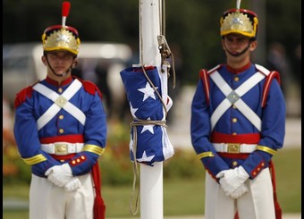 Members of an honor guard stand by a U.S. flag before the arrival of U.S. President Barack Obama at Planalto Palace in Brasilia, Brazil March 19, 2011. REUTERS/Kevin Lamarque (BRAZIL – Tags: POLITICS MILITARY)