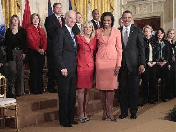 President Barack Obama, first lady Michelle Obama, Vice President Joe Biden and his wife Dr. Jill Biden, pose in the in the East Room of the White House on Tuesday, April 12, 2011, during an event launching the Joining Forces, the national initiative to support and honor America’s service members and their families. (AP Photo/Pablo Martinez Monsivais)