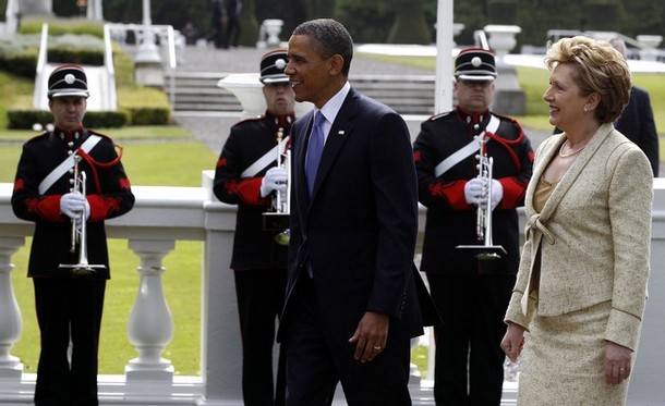 U.S. President Barack Obama (C) walks with Irish President Mary McAleese at the Presidential Residence in Dublin, Ireland, May 23, 2011. Obama is on a four-nation European visit to Ireland, England, France and Poland. REUTERS/Larry Downing (IRELAND – Tags: POLITICS)