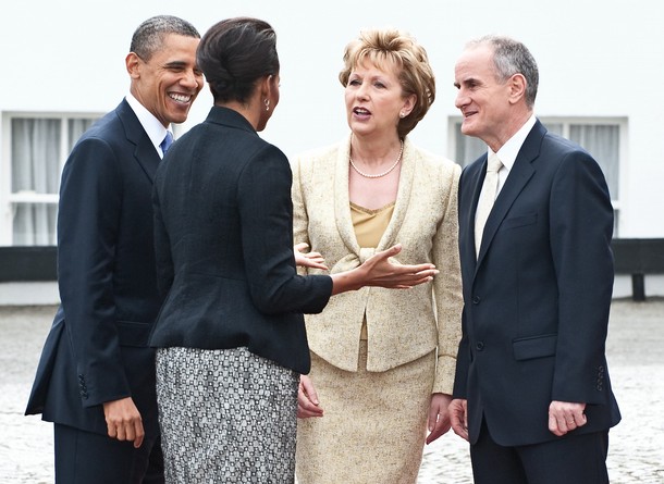 Irish President Mary McAleese (2nd R) and her husband Martin McAleese (R) greet US President Barack Obama (L) and his wife Michelle (2nd L) at the Presidential Residence, in Dublin, Ireland, on May 23, 2011. US President Barack Obama landed in Ireland on Monday for a visit celebrating his ancestral roots, kicking off a four-nation European tour. AFP PHOTO / NICHOLAS KAMM (Photo credit should read NICHOLAS KAMM/AFP/Getty Images)