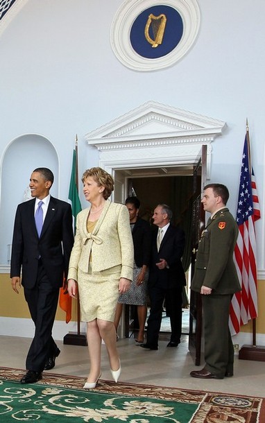 Irish President Mary McAleese (2ndL) walks with US President Barack Obama (L) in the Presidential Residence, in Dublin, Ireland, on May 23, 2011. US President Barack Obama landed in Ireland on May 23, 2011 for a visit celebrating his ancestral roots, kicking off a four-nation European tour. AFP PHOTO/ POOL/ MAXWELL’S (Photo credit should read -/AFP/Getty Images)