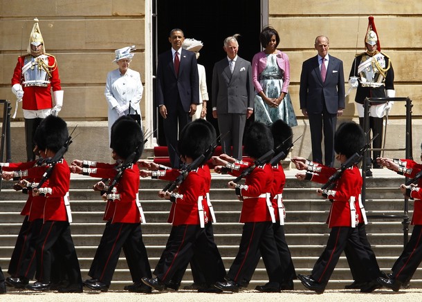 An honor guard passes Queen Elizabeth II, U.S. President Barack Obama, Prince Charles, U.S. first lady Michelle Obama and Prince Philip, Duke of Edinburgh, at Buckingham Palace in London May 24, 2011. Obama is on a four-nation European visit to Ireland, England, France and Poland.