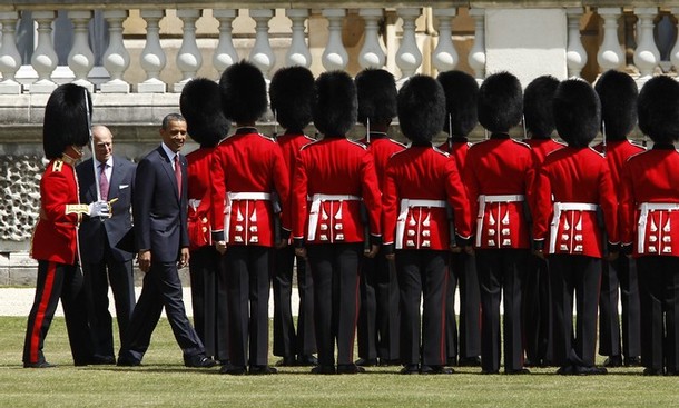 U.S. President Barack Obama reviews an honor guard with Prince Phillip, Duke of Edinburgh, during an official arrival ceremony at Buckingham Palace in London May 24, 2011. REUTERS/Kevin Lamarque (BRITAIN – Tags: POLITICS ROYALS)