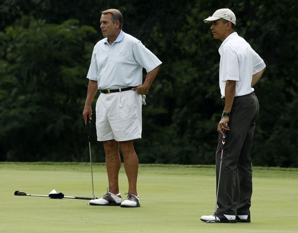 U.S. President Barack Obama and U.S. Speaker of the House John Boehner (L) stand on the first green while putting at Andrews Air Force Base in Maryland, June 18, 2011. REUTERS/Larry Downing (UNITED STATES – Tags: POLITICS ENTERTAINMENT SPORT)
