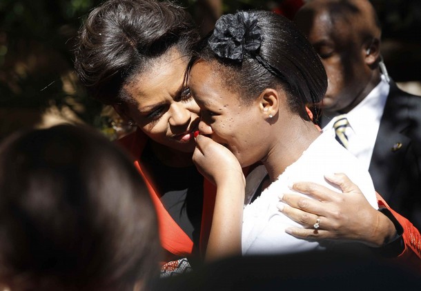 1 Response to U.S. first lady Michelle Obama comforts a woman as she greets her at a multi-generational women leaders luncheon at the Sanitas Tea Garden in Gaborone