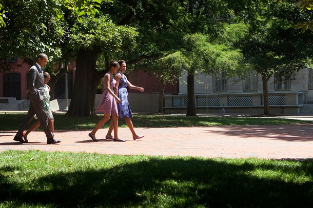 WASHINGTON, DC – JULY 17: (AFP OUT) U.S. President Barack Obama (L) and first lady Michelle Obama (2R) walk with their daughters Sasha (2L) and Malia (R) through Lafayette Square from St. John’s Protestant Episcopal Church to the White House July 17, 2011 in Washington, DC. The First Family attended Sunday services. (Photo by Brendan Smialowski-Pool/Getty Images)