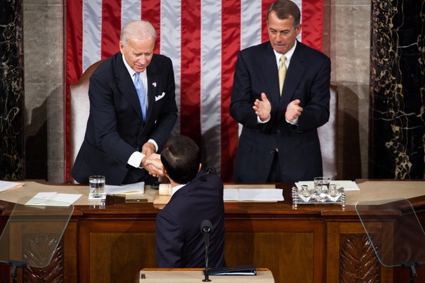WASHINGTON – OCTOBER 13: President Lee Myung-bak 9c0 of South Korea shakes hands with Vice President Joe Biden (L) as Speaker of the House Rep. John Boehner (R-OH) watches after Lee addressed a joint session of Congress on October 13, 2011 in Washington, DC. President Lee is on a state visit to the United States. (Photo by Brendan Hoffman/Getty Images)