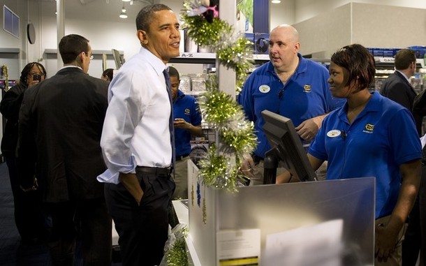 US President Barack Obama (C) purchases gifts while shopping at Best Buy in Alexandria, Virginia, December 21, 2011. AFP PHOTO/Jim WATSON (Photo credit should read JIM WATSON/AFP/Getty Images)