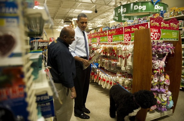 US President Barack Obama (C) speaks with a clerk as he shops for a Christmas bone for the Obama family dog, Bo, while at Pet Smart in Alexandria, Virginia, December 21, 2011. AFP PHOTO/Jim WATSON (Photo credit should read JIM WATSON/AFP/Getty Images)