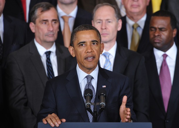US President Barack Obama speaks on “Insourcing American Jobs” while standing infront of a group of business leaders January 11, 2012 in the East Room of the White House in Washington, DC. AFP PHOTO/Mandel NGAN (Photo credit should read MANDEL NGAN/AFP/Getty Images)