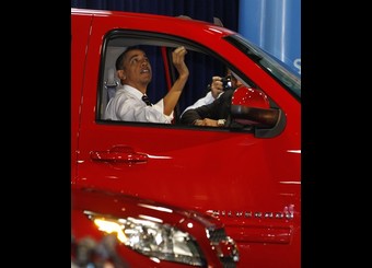 U.S. President Barack Obama sits inside a Chevrolet Silverado truck at the 2012 Washington Auto Show at the Walter E. Washington Convention Center in Washington, January 31, 2012. REUTERS/Larry Downing (UNITED STATES – Tags: POLITICS BUSINESS TRANSPORT)