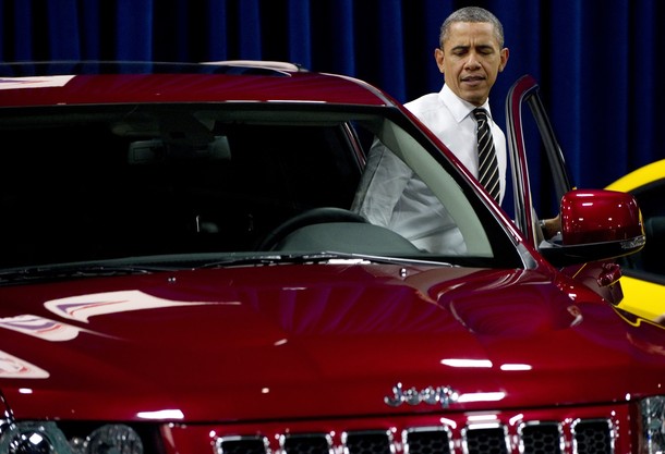 US President Barack Obama gets inside a Jeep Grand Cherokee SUV as he tours the 2012 Washington Auto Show at the Washington Convention Center in Washington, DC, January 31, 2012. AFP PHOTO / Saul LOEB (Photo credit should read SAUL LOEB/AFP/Getty Images)