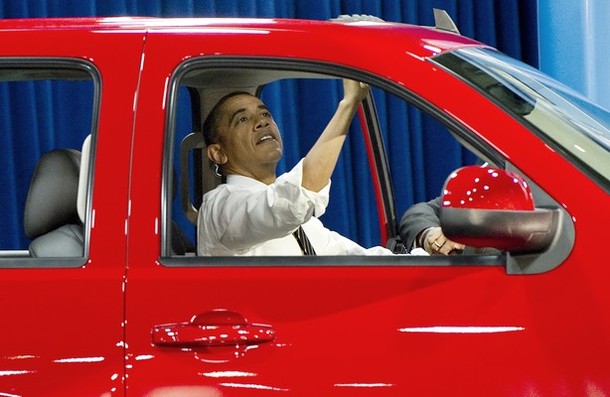 US President Barack Obama sits inside a Chevrolet Silverado pickup truck as he tours the 2012 Washington Auto Show at the Washington Convention Center in Washington, DC, January 31, 2012. AFP PHOTO / Saul LOEB (Photo credit should read SAUL LOEB/AFP/Getty Images)