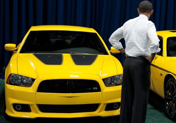US President Barack Obama takes a look at a Dodge Charger as he tours the 2012 Washington Auto Show at the Washington Convention Center in Washington, DC, January 31, 2012. AFP PHOTO / Saul LOEB (Photo credit should read SAUL LOEB/AFP/Getty Images)