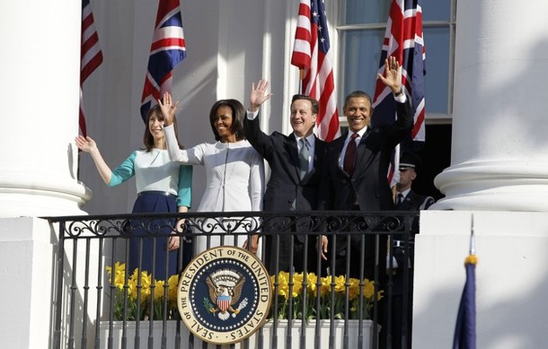 U.S. President Barack Obama with first lady Michelle Obama (2nd L) and British Prime Minister David Cameron and wife Samantha Cameron (L) wave from the White House balcony after an official Arrival Ceremony on the South Lawn of the White House in Washington, March 14, 2012. REUTERS/Jason Reed (UNITED STATES – Tags: POLITICS)