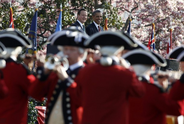 U.S. President Barack Obama (TOP-R) and British Prime Minister David Cameron watch the Old Guard fife and drum corp during an official Arrival Ceremony on the South Lawn of the White House in Washington, March 14, 2012. REUTERS/Larry Downing (UNITED STATES – Tags: POLITICS)