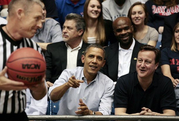 U.S. President Barack Obama and British Prime Minister David Cameron talk at a first round “First Four” game of the NCAA Division I Men’s Basketball Tournament between Mississippi Valley State and Western Kentucky at the University of Dayton Arena in Ohio, March 13, 2012. REUTERS/Larry Downing (UNITED STATES – Tags: POLITICS SPORT BASKETBALL)