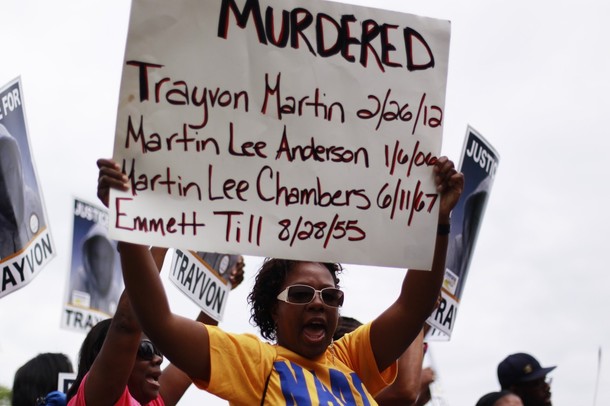 Demonstrators hold signs aloft as they march during an NAACP march and rally to the front of the Sanford Police Department for Trayvon Martin in Sanford, Florida, March 31, 2012. Sanford is the town where Trayvon Martin, 17, was shot dead on February 26 after George Zimmerman, 28, a Hispanic neighborhood watch captain, believed the young man walking through the gated community in a hooded sweatshirt looked suspicious. REUTERS/Lucas Jackson (UNITED STATES – Tags: CRIME LAW CIVIL UNREST POLITICS)