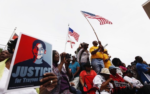 Demonstrators hold up signs and flags as they take part in an NAACP march and rally in front of the Sanford Police Department for Trayvon Martin in Sanford, Florida, March 31, 2012. Sanford is the town where Martin, 17, was shot dead on February 26 after George Zimmerman, 28, a Hispanic neighborhood watch captain, believed the young man walking through the gated community in a hooded sweatshirt looked suspicious. REUTERS/Lucas Jackson (UNITED STATES – Tags: CRIME LAW CIVIL UNREST)