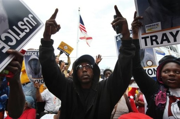 Wayne Wilson shows his support as he joins other protesters in a march and rally for slain Florida teenager Trayvon Martin on Saturday, March 31, 2012 in Sanford, Fla. Protesters carried signs, chanted Justice for Trayvon, and clutched the hands of their children while they walked from Crooms Academy of Information Technology, the county s first high school for black students, to the Sanford Police Department. The march was organized by the NAACP was one of several taking place over the weekend. Martin was shot to death by 28-year-old George Zimmerman on Feb. 26 as he walked from back from a convenience store to his father s fianc e s home in a gated community outside Orlando. (AP Photo/Julie Fletcher)