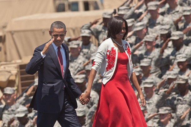 HINESVILLE, GA – APRIL 27: U.S. President Barack Obama and first lady Michelle Obama salute as they are welcomed by soldiers at Fort Stewart army base on April 27, 2012 in Hinesville, Georgia. This is Obama’s first trip to Fort Stewart during which he is scheduled to meet with soldiers and their families. (Photo by Richard Ellis/Getty Images)