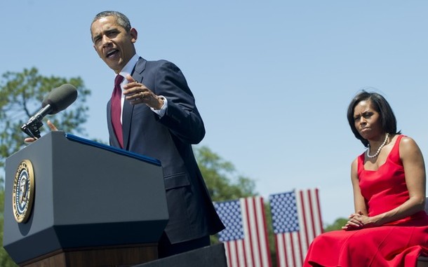 US President Barack Obama speaks, alongside First Lady Michelle Obama, to US troops at Third Infantry Division Headquarters at Fort Stewart in Hinesville, Georgia, on April 27, 2012, prior to Obama signing an Executive Order to help US service members and their families make informed decisions about education and to protect them from deceptive targeting by educational institutions. AFP PHOTO/Saul LOEB (Photo credit should read SAUL LOEB/AFP/GettyImages)