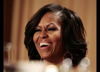 U.S. first lady Michelle Obama laughs at comedian Jimmy Kimmel at the White House Correspondents Association annual dinner in Washington April 28, 2012. REUTERS/Larry Downing (UNITED STATES – Tags: POLITICS ENTERTAINMENT MEDIA)