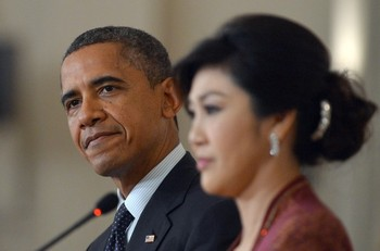 US President Barack Obama speaks as Thai Prime Minister Yingluck Shinawatra looks on during a joint press conference following their bilateral meeting at the Thai Government House in Bangkok on November 18, 2012. Obama landed in Thailand on November 18, intensifying his diplomatic ‘pivot’ to Asia, on a tour which will see him make history by visiting Myanmar in a bid to encourage political reform.
