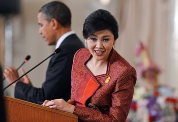 Thai Prime Minister Yingluck Shinawatra (R) asks an assistant to translate a question as US President Barack Obama (L) answers during a joint press conference at the Thai Government House in Bangkok on November 18, 2012. Obama landed in Thailand on November 18, intensifying his diplomatic ‘pivot’ to Asia, on a tour which will see him make history by visiting Myanmar in a bid to encourage political reform.
