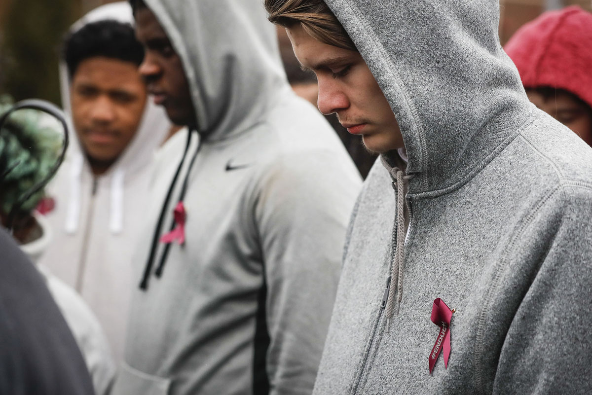 Students wear #ENOUGH pins as they gather on their soccer field during a 17-minute walkout protest at the Stivers School for the Arts, Wednesday, March 14, 2018, in Dayton, Ohio. Students across the country planned to participate in walkouts Wednesday to protest gun violence, one month after the deadly shooting inside a high school in Parkland, Fla. (AP Photo/John Minchillo)