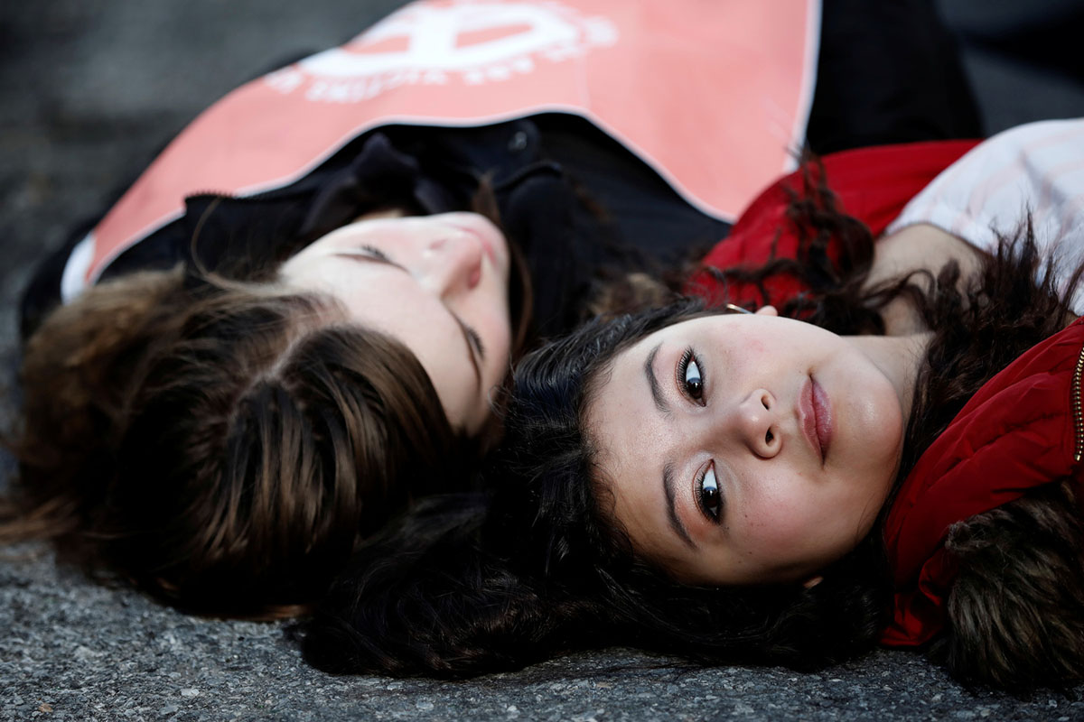 Students from Fiorello H. Laguardia High School lie down on West 62nd street in support of the National School Walkout in the Manhattan borough of New York City, New York, U.S., March 14, 2018. REUTERS/Mike Segar – RC1F52991260