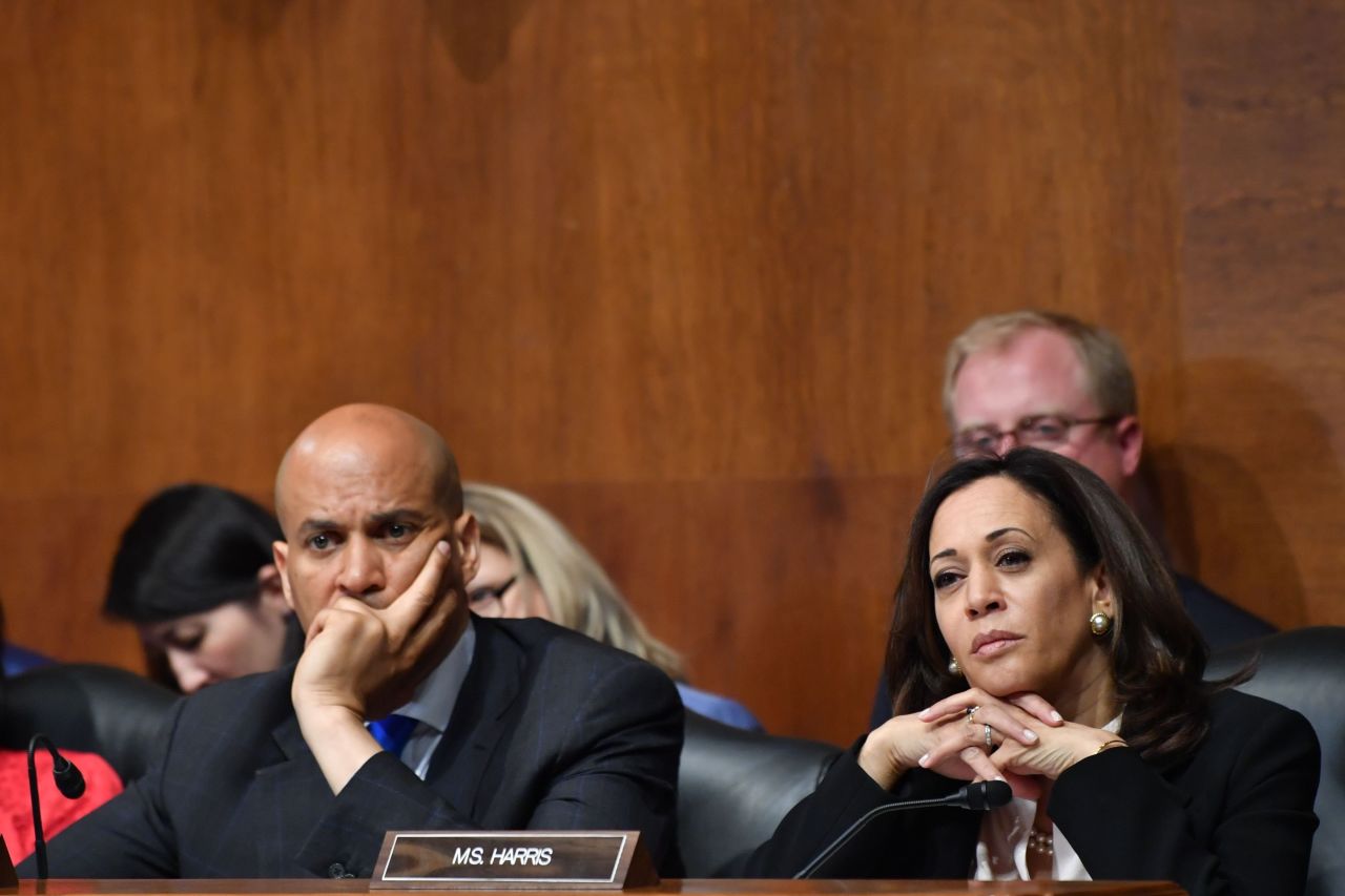 Sen. Kamala Harris asks a question as U.S. Attorney General William Barr testifies before a Senate Judiciary Committee hearing on Capitol Hill in Washington