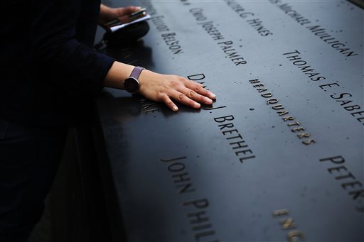 A woman places a hand on the names engraved along the South reflecting pool at the Ground Zero memorial site during the dedication ceremony of the National September 11 Memorial Museum in New York on Thursday, May 15, 2014