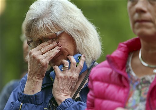 A woman wipes away tears at the Ground Zero memorial site while watching the dedication ceremony of the National September 11 Memorial Museum at in New York on Thursday, May 15, 2014.