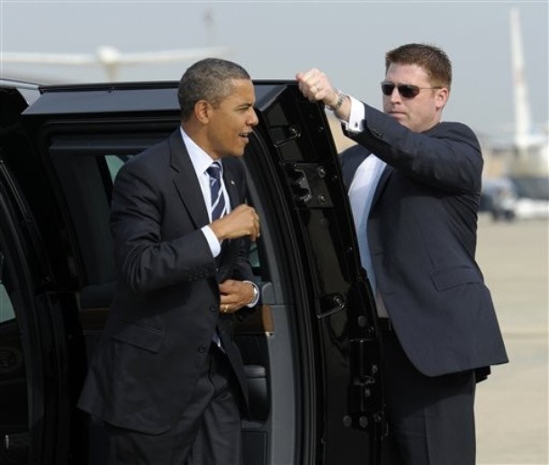 President Barack Obama gets out of his car before boarding Air Force One at Andrews Air Force Base in Md., Tuesday, Oct. 11, 2011, on his way to visit the International Brotherhood of Electrical Workers (IBEW) Local No. 5 Training Center. (AP Photo/Susan Walsh)