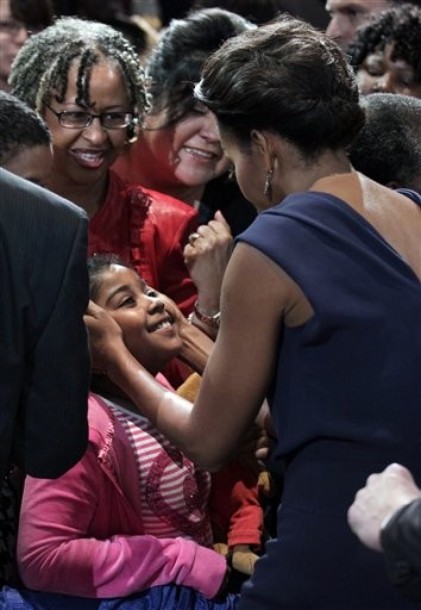 First lady Michelle Obama greets a small girl in the audience at Northland, A Church Distributed, Saturday, Feb. 11, 2012, in Longwood, Fla. The first lady spoke about the work of faith and community organizations to support healthy lifestyles at a multi-faith gathering during her three day national tour celebrating the second anniversary of Let’s Move. (AP Photo/Carolyn Kaster)