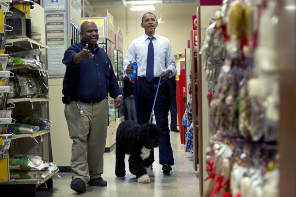 ALEXANDRIA, VA – DECEMBER 21: U.S. President Barack Obama (R) shops for Christmas presents with his dog Bo at Petsmart on December 21, 2011 in Alexandria, Virginia. President Obama called on House Speaker Rep. John A. Boehner (R-OH) on to urge him again to allow a vote on a Senate-passed measure that would extend a payroll tax holiday for two months. (Photo by Kevin Dietsch-Pool/Getty Images)