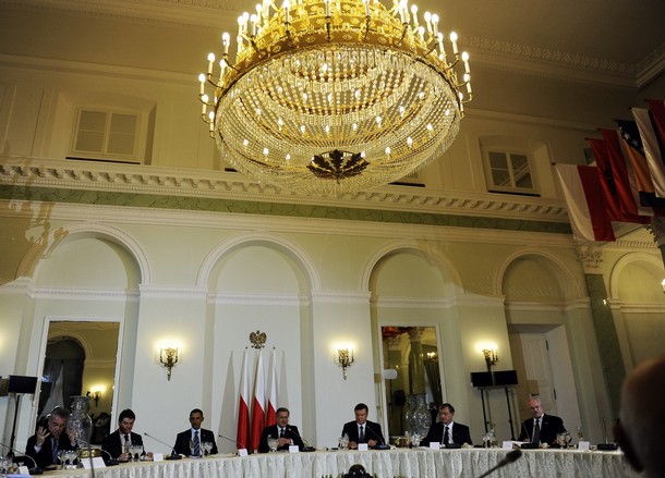 Seated L-R, Austrian President Heinz Fischer, Albanian President Bamir Topi, US President Barack Obama, Polish President Bronislaw Komorowski, Ukrainan President Viktor Yanukovych, Slovenian President Danilo Turk, Slovakian President Ivan Gasparovic take part in a dinner for central European leaders at the presidential palace in Warsaw on May 27, 2011. The US president landed in Poland today on the final leg of his European tour, to meet leaders from ex-communist states whose own reforms could hold lessons for the Arab Spring. AFP Photo/Jewel Samad (Photo credit should read JEWEL SAMAD/AFP/Getty Images)
